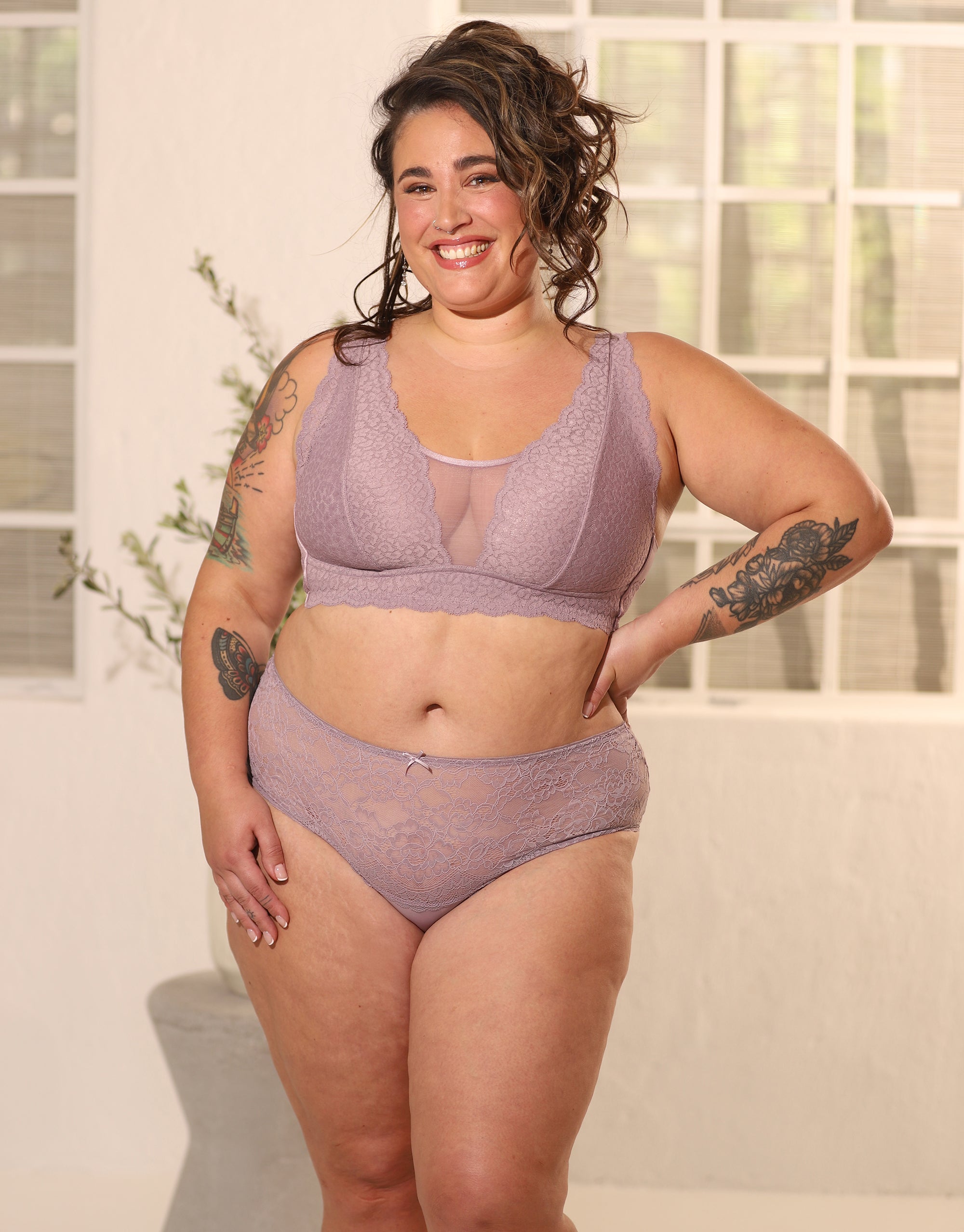 The Lace Basic high panty in violet-grey captures the magic of the moment when day slowly fades into night. This elegant violet-grey is reminiscent of the delicate shimmer of dusk – mysterious, calm and full of allure.